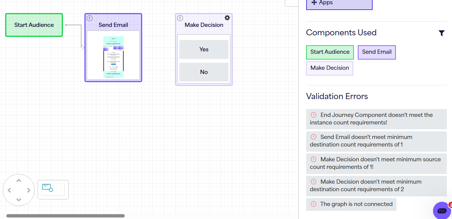 Validation errors will show throughout the journey building process, but you only need to pay attention to these errors if you believe the journey is complete and ready to send.