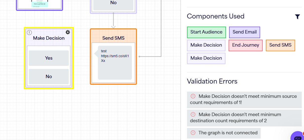 This means that the Make Decision component doesn't have a source i.e. there is no route leading into the decision stage in the journey. This would be resolved in the same way as the error types above, by simply making sure the components are connected, following the desired path and logic of your journey.